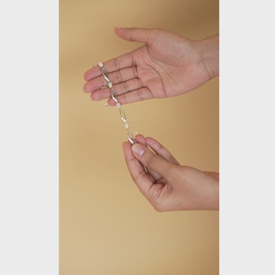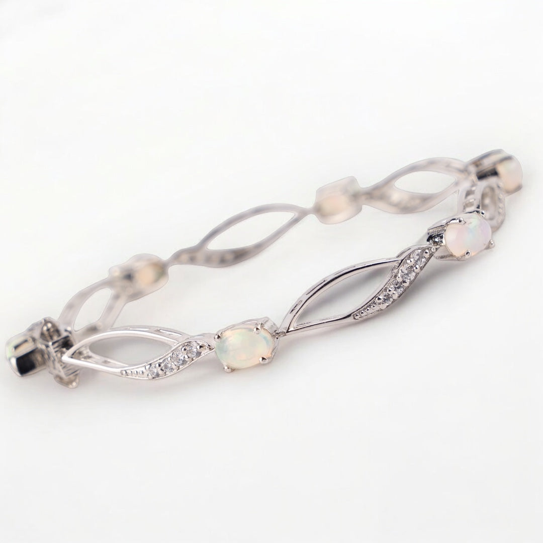 Featuring luminous oval-cut opals that radiate a soft, iridescent glow, each gemstone is delicately set between gracefully curved marquise-shaped links accented with shimmering white topaz. The intricate openwork design adds a touch of sophistication and modern flair, while the secure clasp ensures a comfortable and reliable fit. Ideal for both special occasions and everyday luxury, this bracelet is a timeless piece that celebrates refined beauty and understated charm.