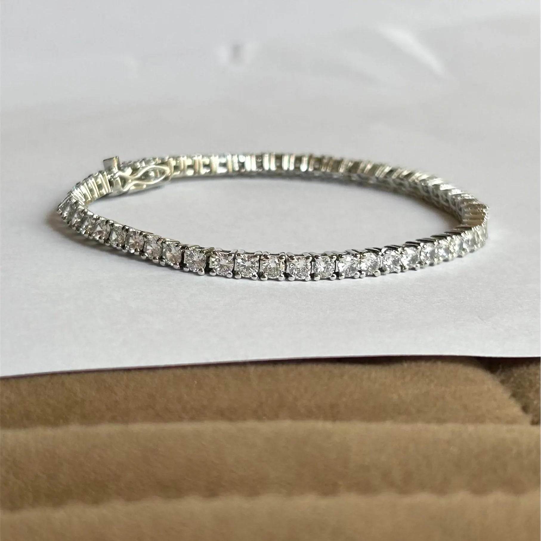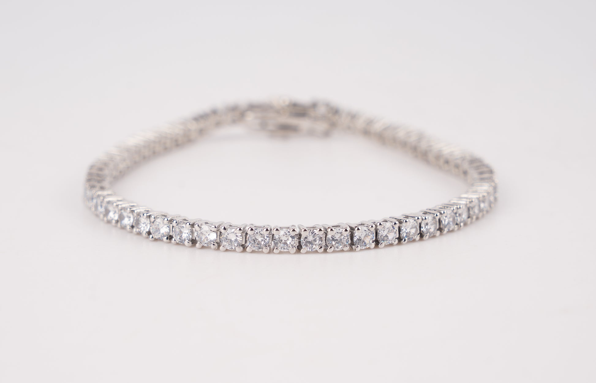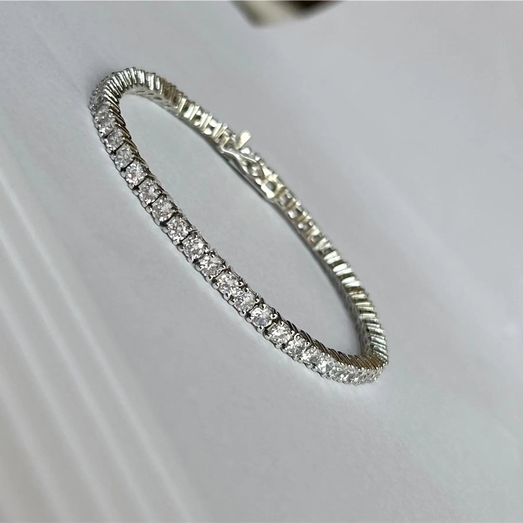 This elegant tennis bracelet showcases a continuous row of brilliant-cut white zircon stones, each expertly set in high-polish sterling silver. The pristine sparkle of the zircon stones offers a timeless and luxurious look, closely resembling diamonds in their brilliance. Secured with a sturdy box clasp and safety latch, this bracelet combines classic sophistication with everyday wearability, making it a perfect accessory for both special occasions and refined daily elegance