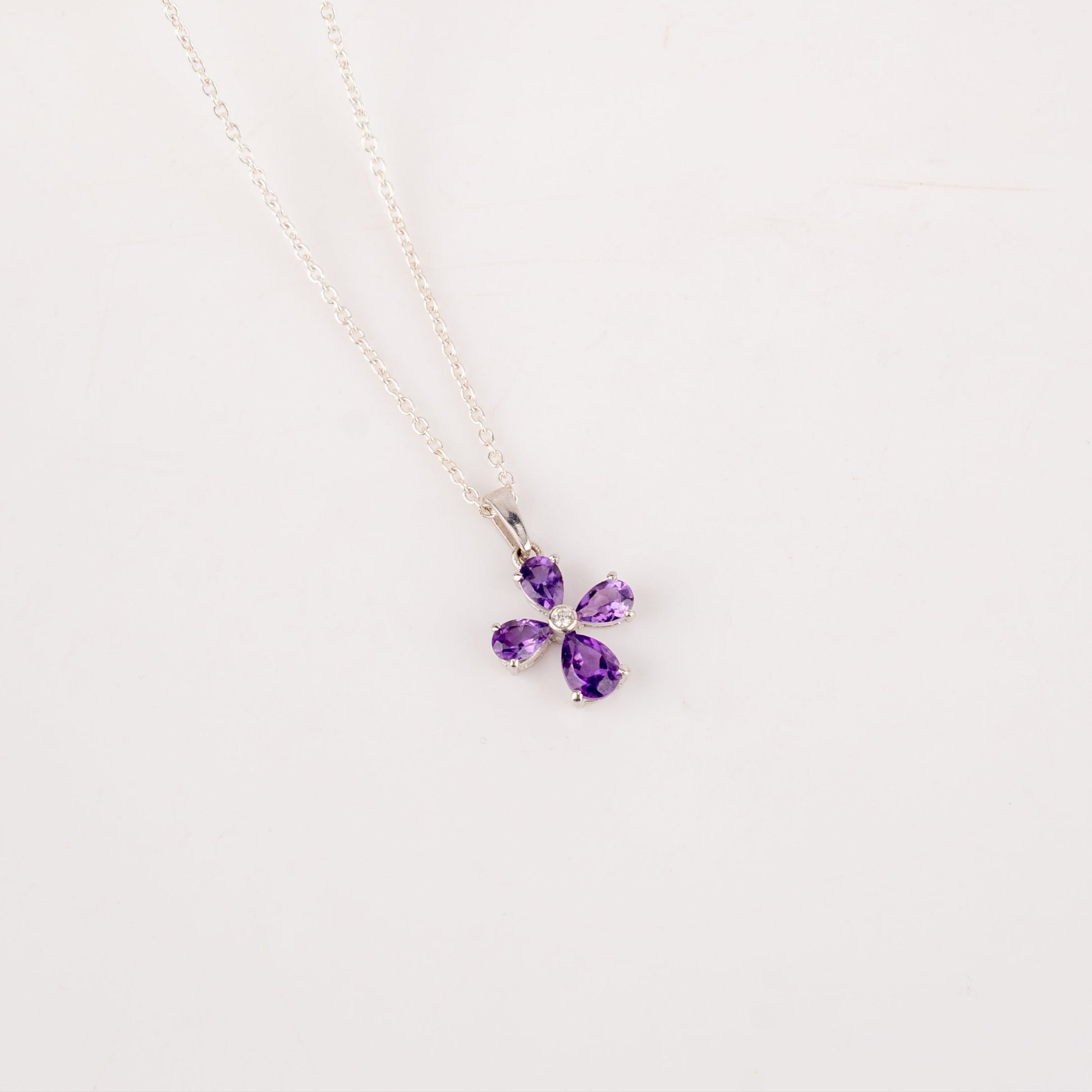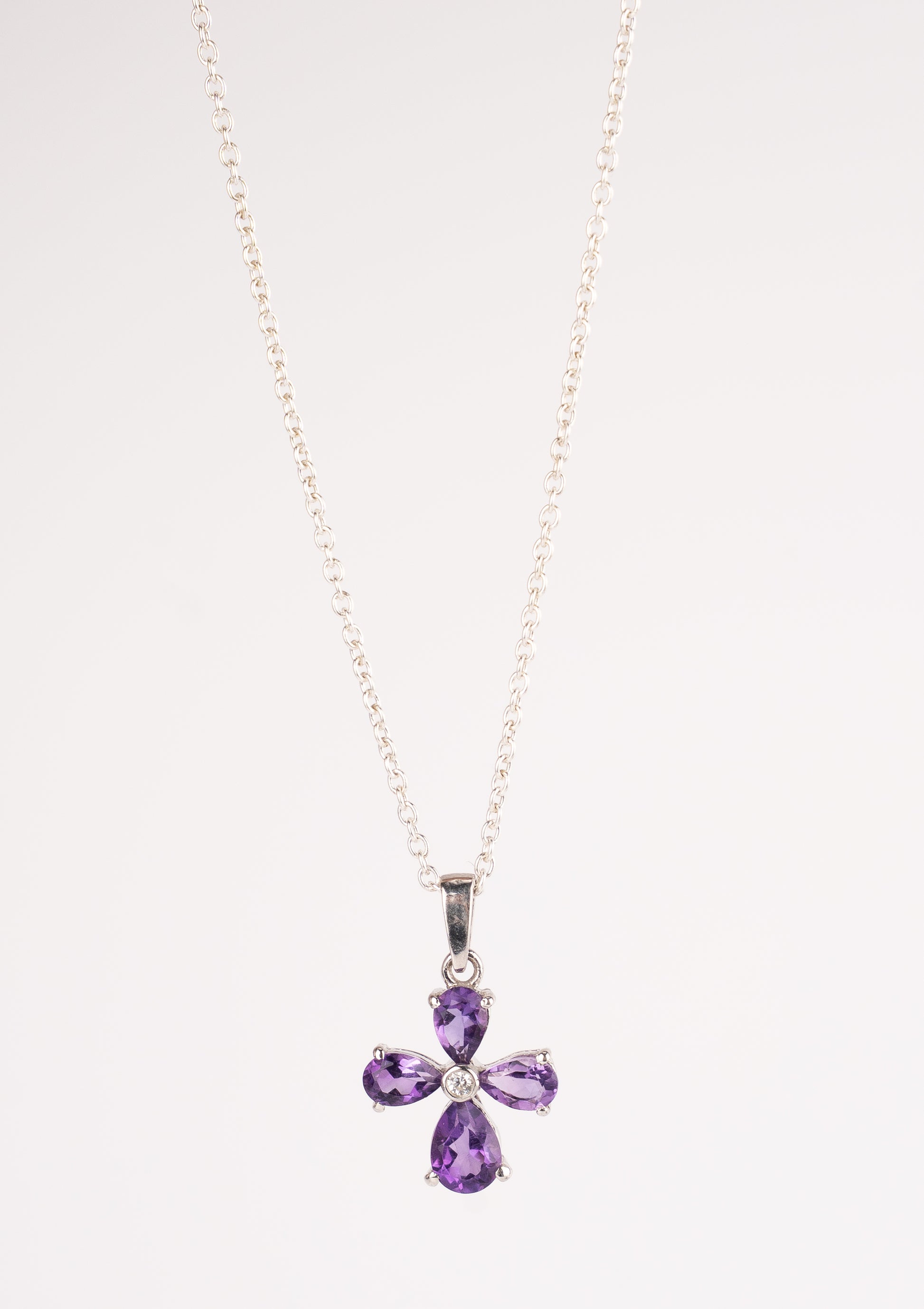 Radiating elegance and charm, this pendant features a stunning floral design crafted from four pear-shaped gemstones arranged in a cross-like bloom. Set in high-polish sterling silver, each petal encircles a sparkling central white stone, adding a touch of brilliance and balance. Suspended from a delicate silver chain, this pendant effortlessly combines bold color with graceful symmetry—perfect for adding a touch of sophistication to any outfit, from daywear to evening glamour.
