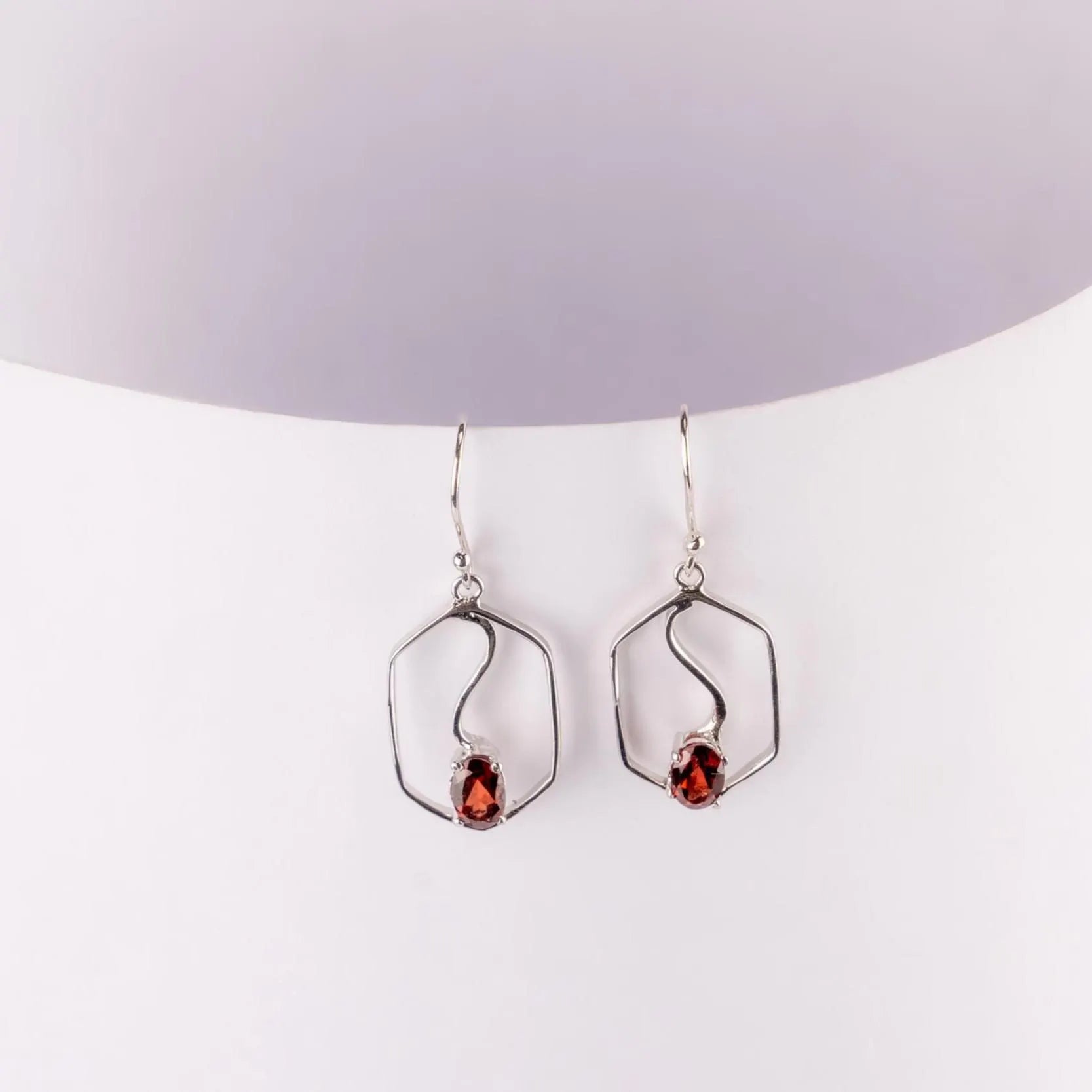 Make a bold yet graceful statement with these elegant earrings, featuring a sleek hexagonal frame and a flowing wave-like silver curve that delicately cradles a deep red oval gemstone. The lightweight design and artistic silhouette offer a contemporary edge, perfect for both casual chic and evening elegance. Crafted in high-quality sterling silver, these earrings balance modern geometry with timeless allure.
