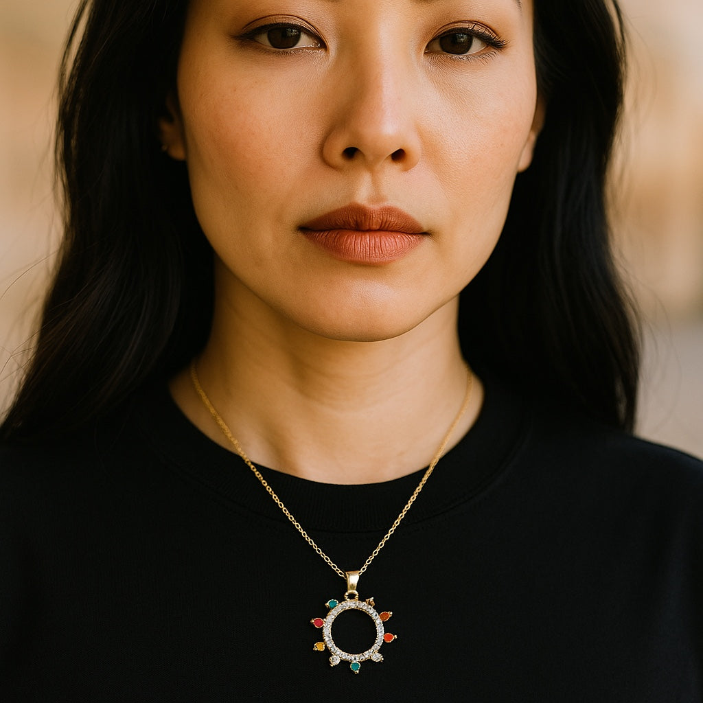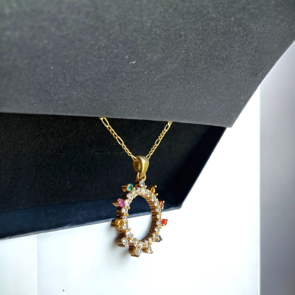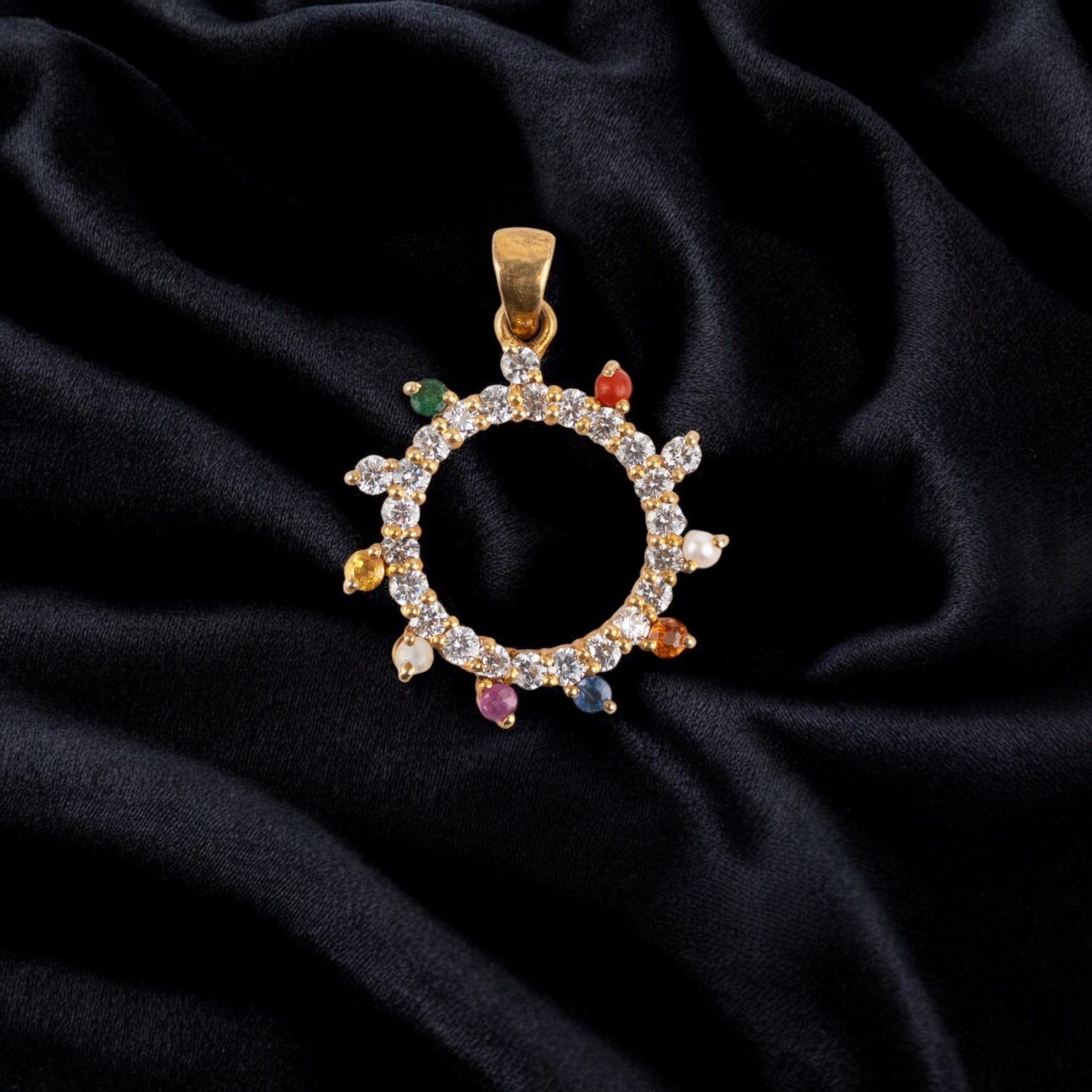 Celebrate timeless tradition and cosmic harmony with this stunning Gold-Plated Navratna Circular Pendant. Designed with nine vibrant gemstones representing the Navgrahas (nine celestial planets), this pendant is beautifully accented with sparkling cubic zirconia stones. Its elegant circular design and spiritual significance make it a perfect accessory for both daily wear and festive occasions.