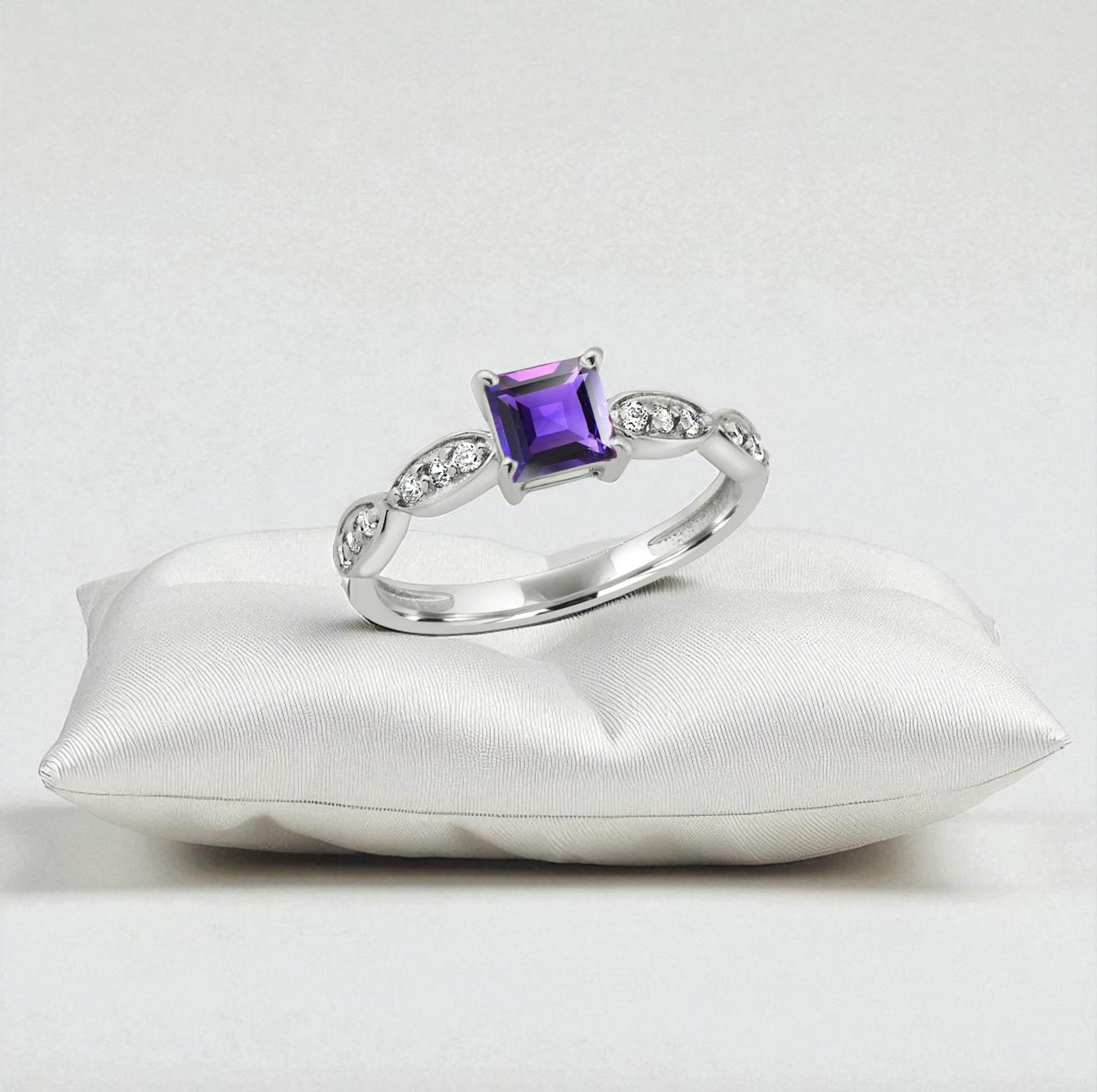 Princess Cut Amethyst Zircon Ring – Sterling Silver Marquise Accent Purple Gemstone Jewelry