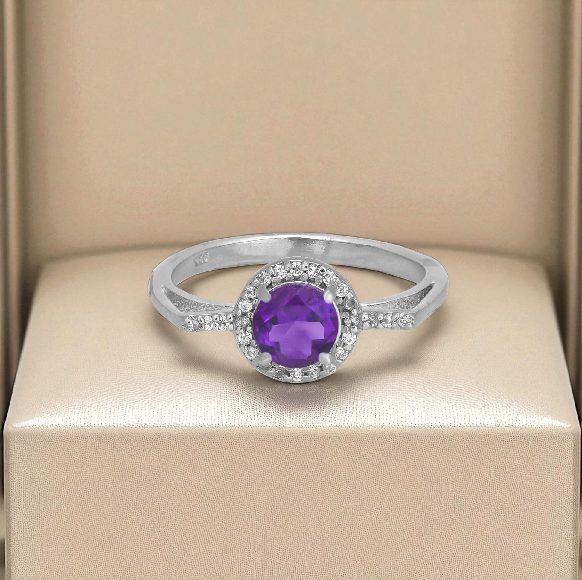Radiant Amethyst Zircon Halo Ring – Sparkling Sterling Silver Elegance for Women