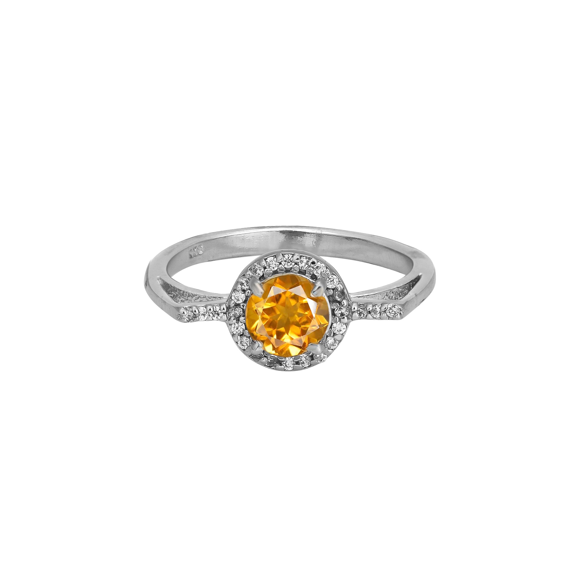 Brighten any look with this radiant sterling silver ring, featuring a brilliant round-cut citrine zircon surrounded by a shimmering halo of sparkling zircons. The contemporary split band design emphasizes the golden yellow centerpiece, making it a stunning choice for those who love unique, eye-catching statement pieces. Perfect for birthdays, anniversaries, engagements, or adding a pop of color to everyday style. Each ring is crafted for elegance and lasting shine—an essential addition to any jewelry collection.