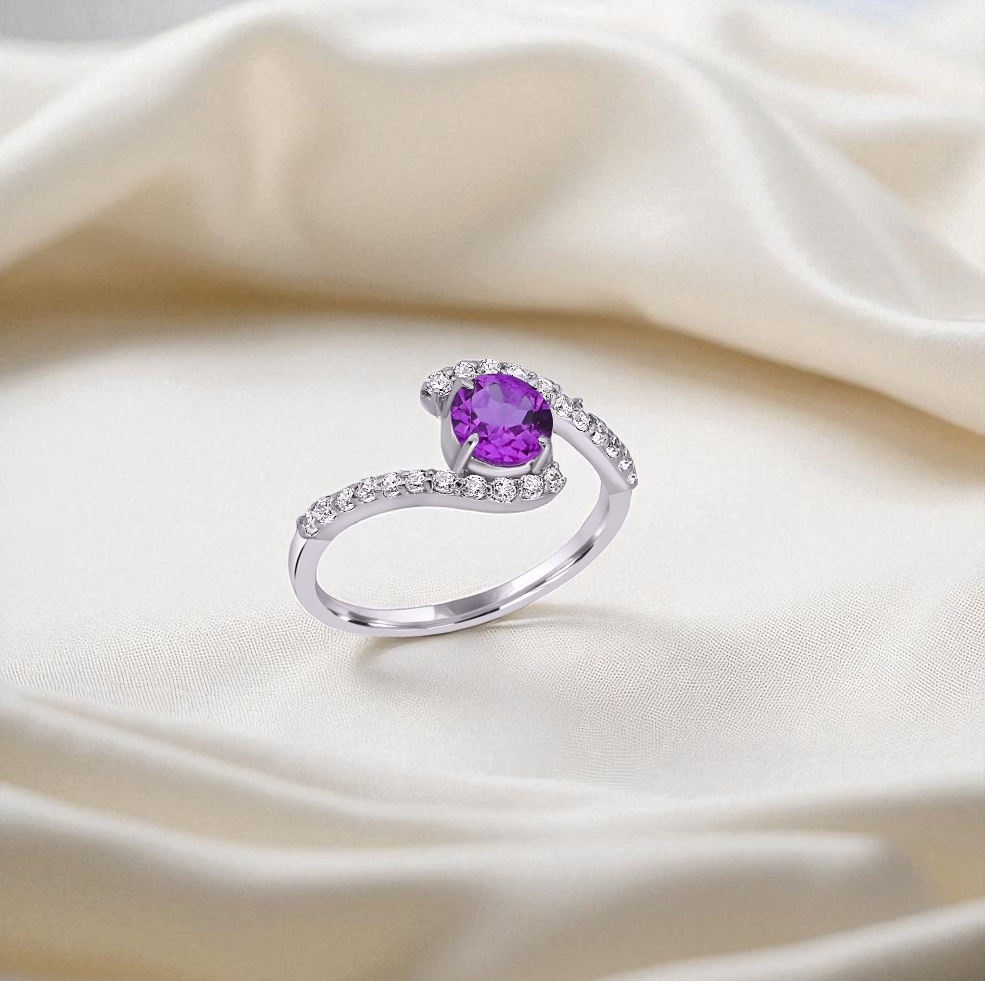 Elevate your jewelry collection with this striking sterling silver purple zircon and diamond accent bypass ring, crafted for women who love unique, modern style. The centerpiece is a vivid round-cut purple zircon gemstone—a trending alternative to expensive stones in 2025, known for its dazzling brilliance and deep color. Flanked by shimmering diamond accents, the sleek asymmetrical bypass design creates a captivating visual flow that’s both bold and elegant.