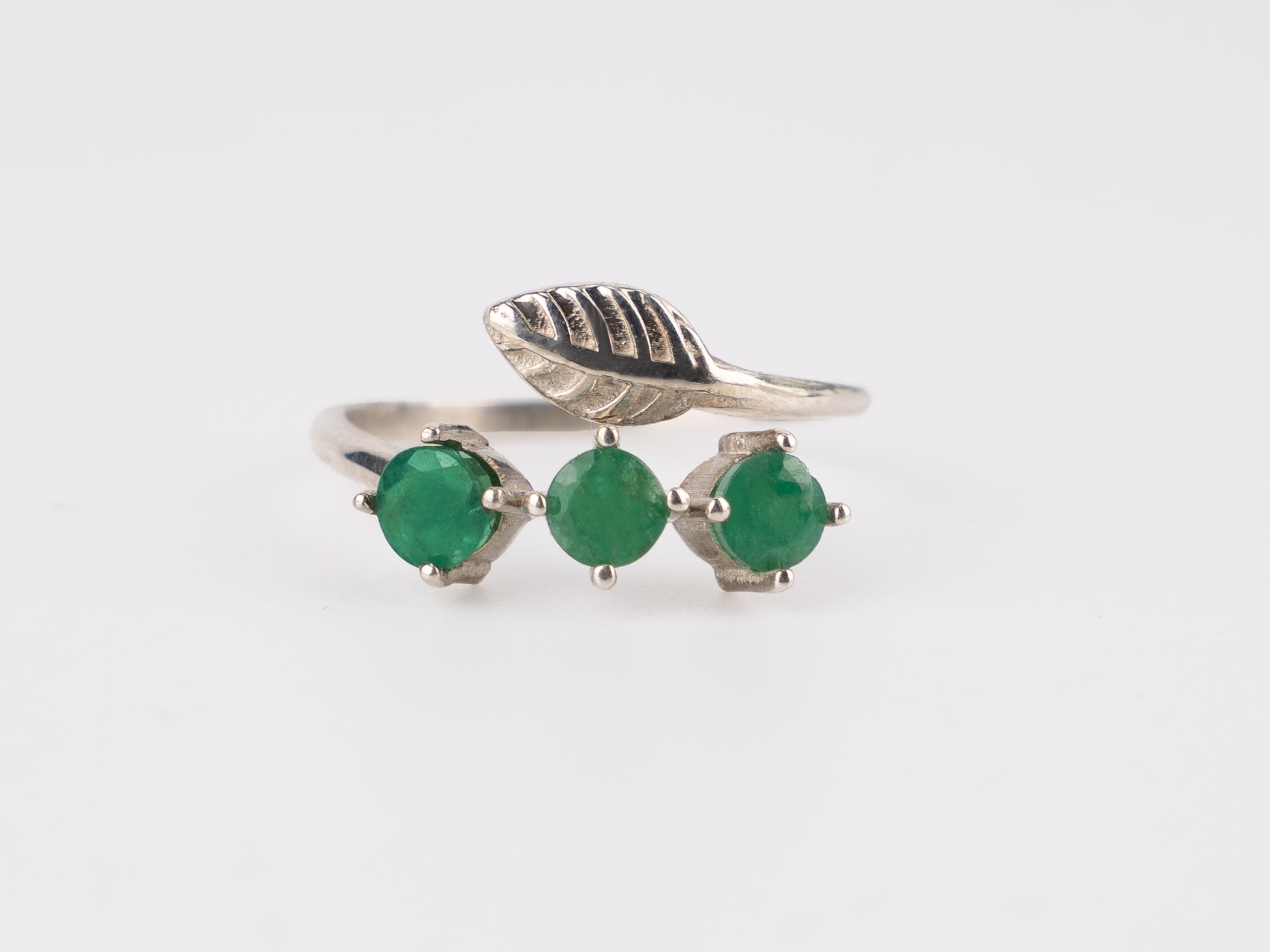 The three vibrant emerald stones are securely prong-set, creating a striking contrast against the polished silver band. With its graceful, organic design and adjustable fit, this ring is ideal for daily wear or as a meaningful gift for nature lovers, birthdays, anniversaries, or special occasions.