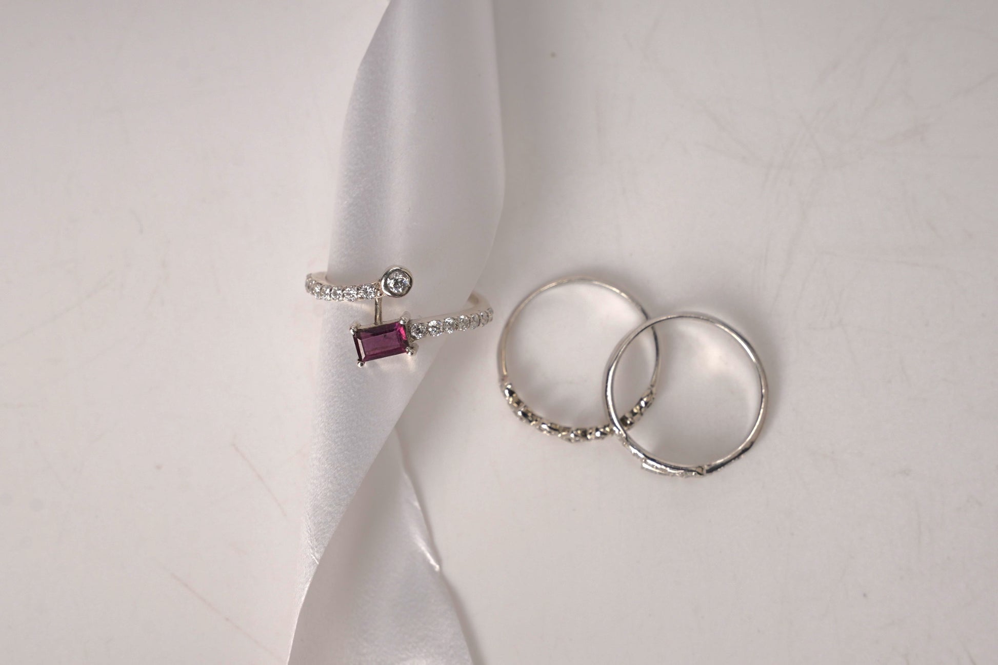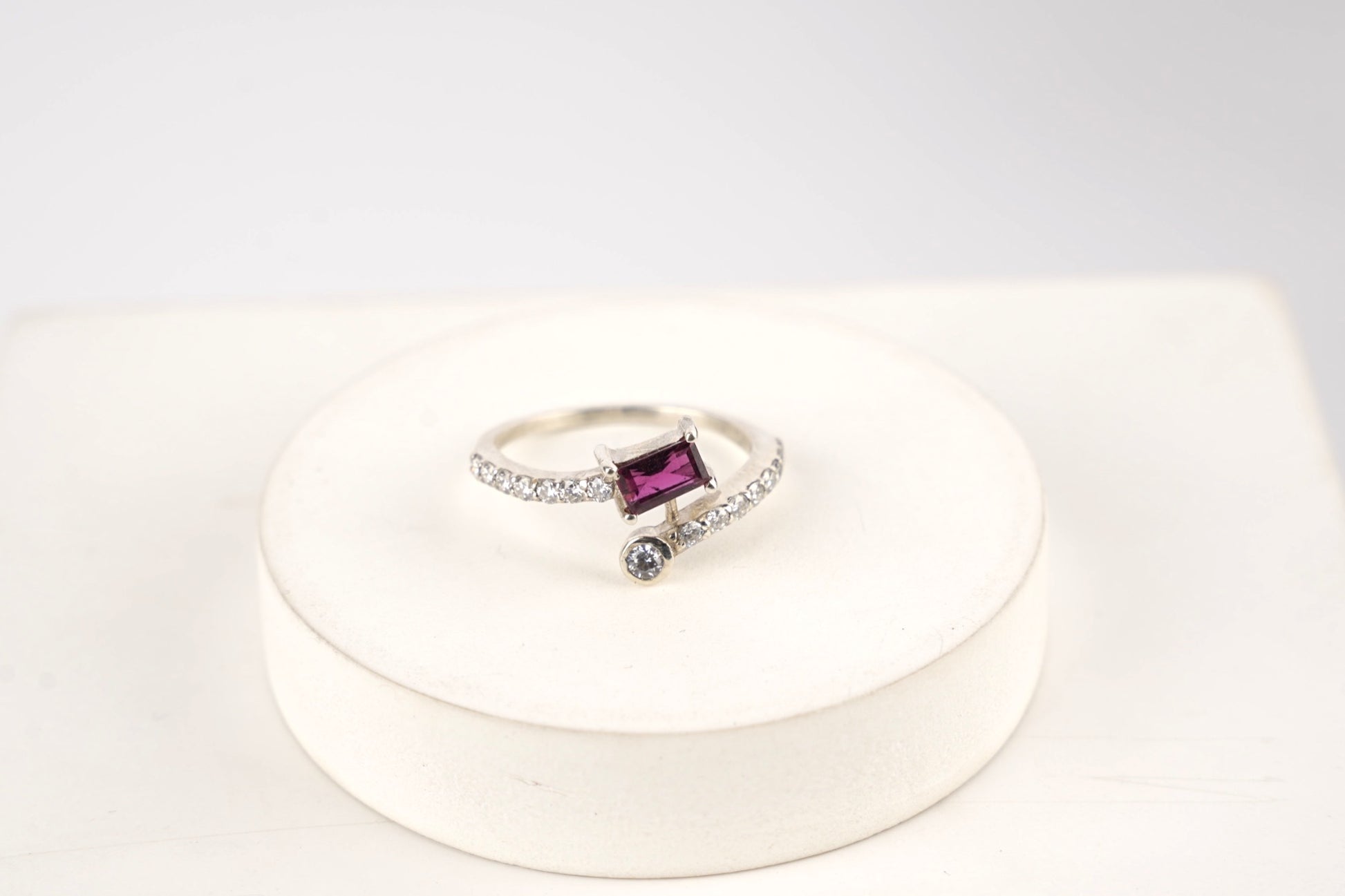 Sterling Silver Open Band Ring with Baguette-Cut Pink Tourmaline & CZ Accents – Adjustable Statement or Promise Ring for Women