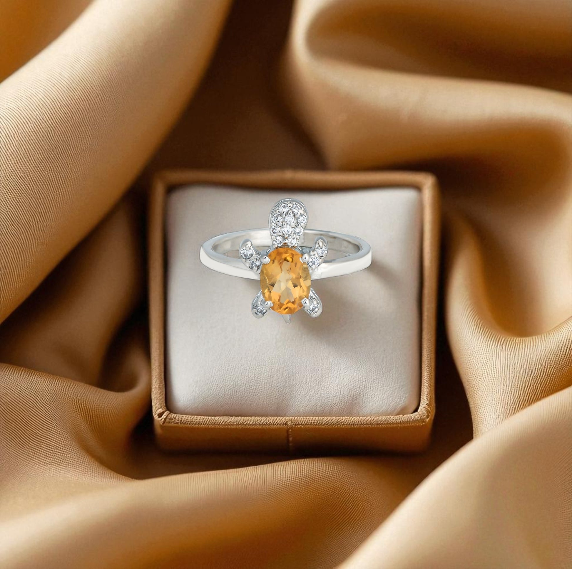 Sterling Silver Turtle Ring with Citirne Gemstone and Zircon Accents – Trendy 2025 Animal Jewelry for Women
