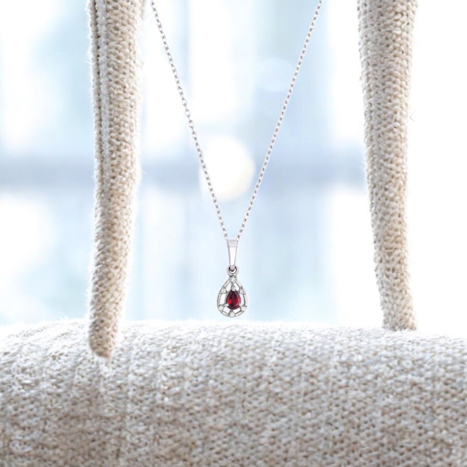 - Primary Gemstone: Pear-shaped red garnet (centerpiece)