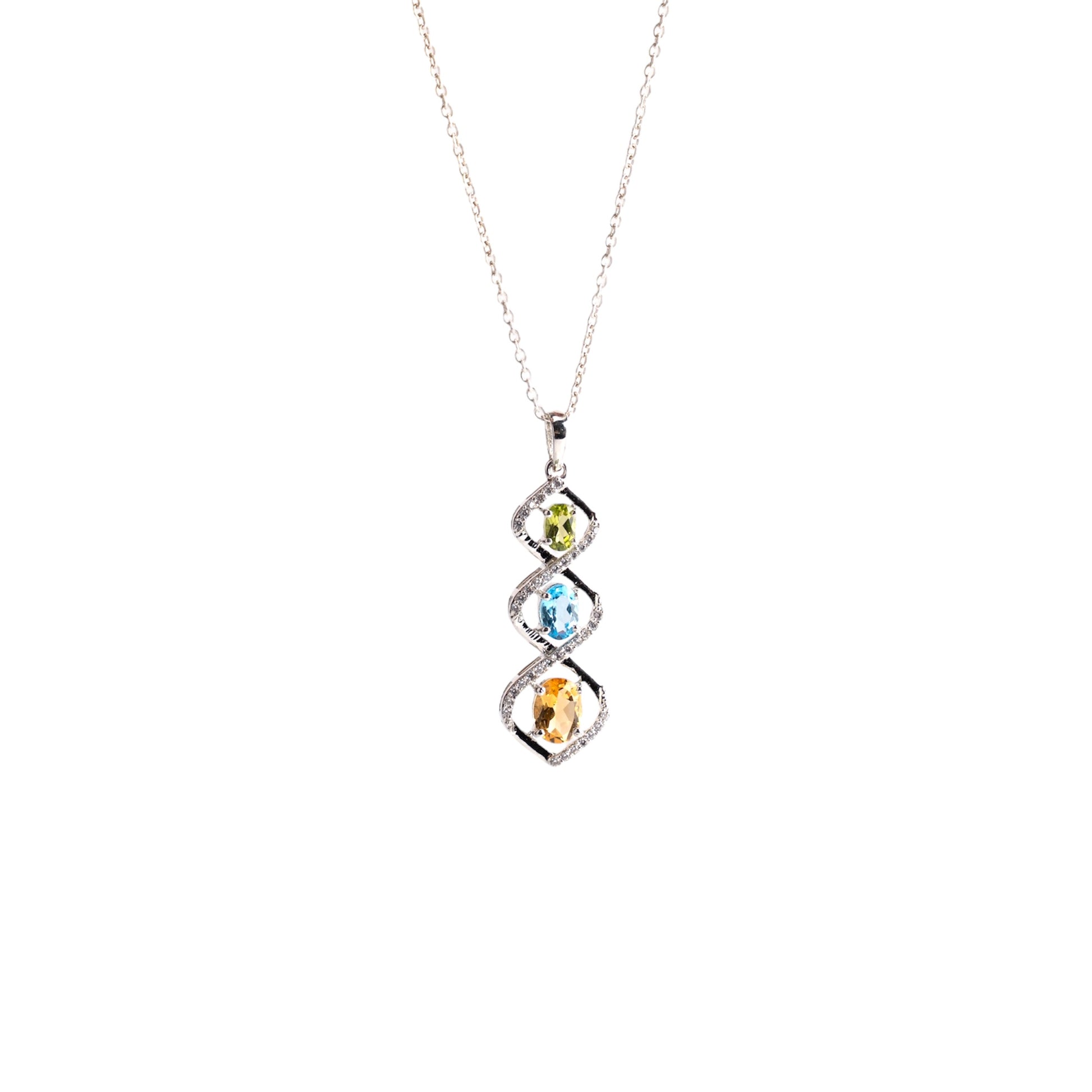 Add a touch of sophistication and vibrant color to your jewelry collection with this exquisite pendant necklace. Crafted from high-quality sterling silver, the pendant features a trio of dazzling oval-cut gemstones—peridot green, blue topaz, and citrine yellow—each encased in a delicate, twisted infinity-style setting encrusted with shimmering white stones. Suspended from a sleek, durable silver chain, this necklace effortlessly combines modern elegance with timeless charm. Perfect for everyday wear or special occasions, it makes a thoughtful gift or a stylish treat for yourself.