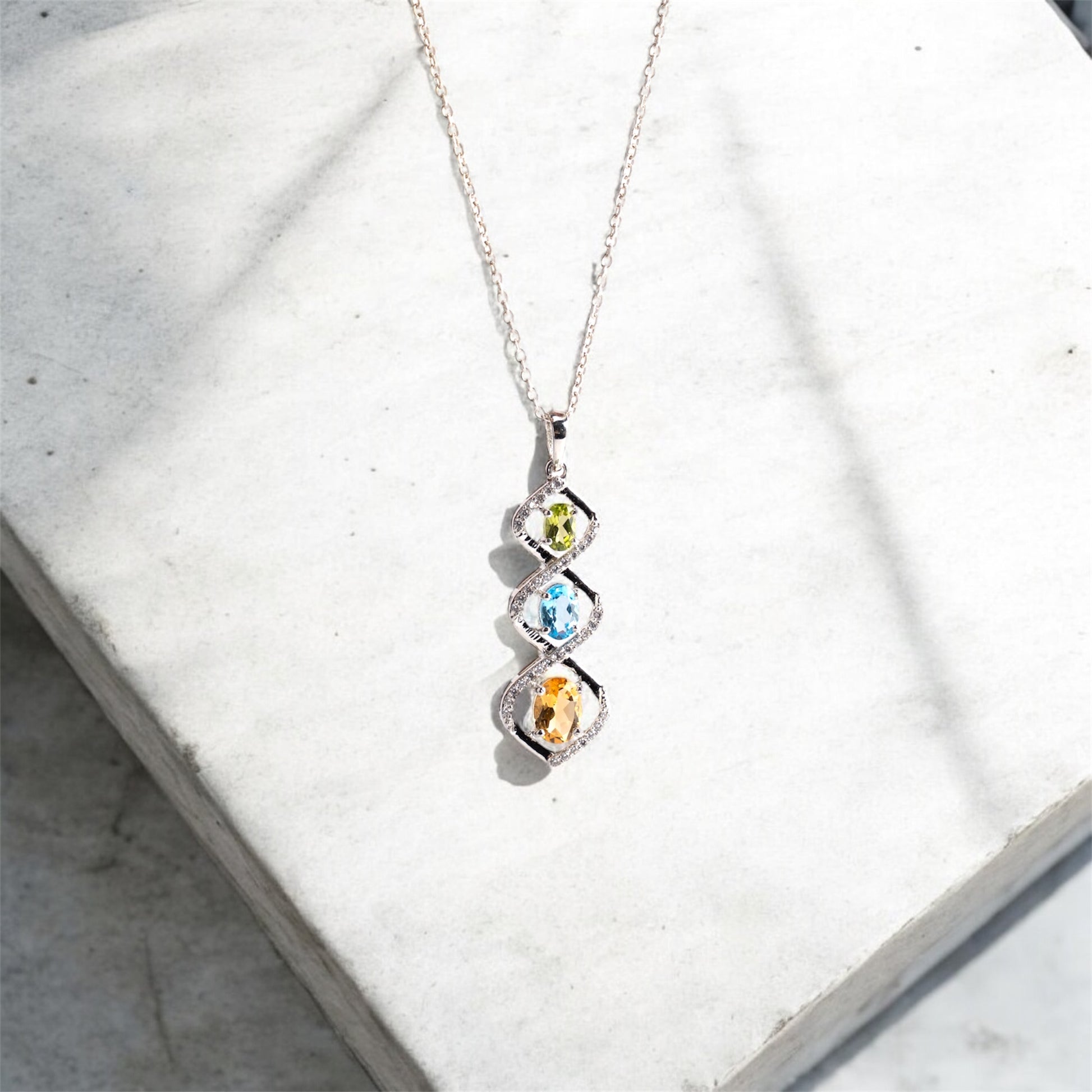 Trio Harmony Pendant – Citrine, Blue Topaz & Peridot Elegance