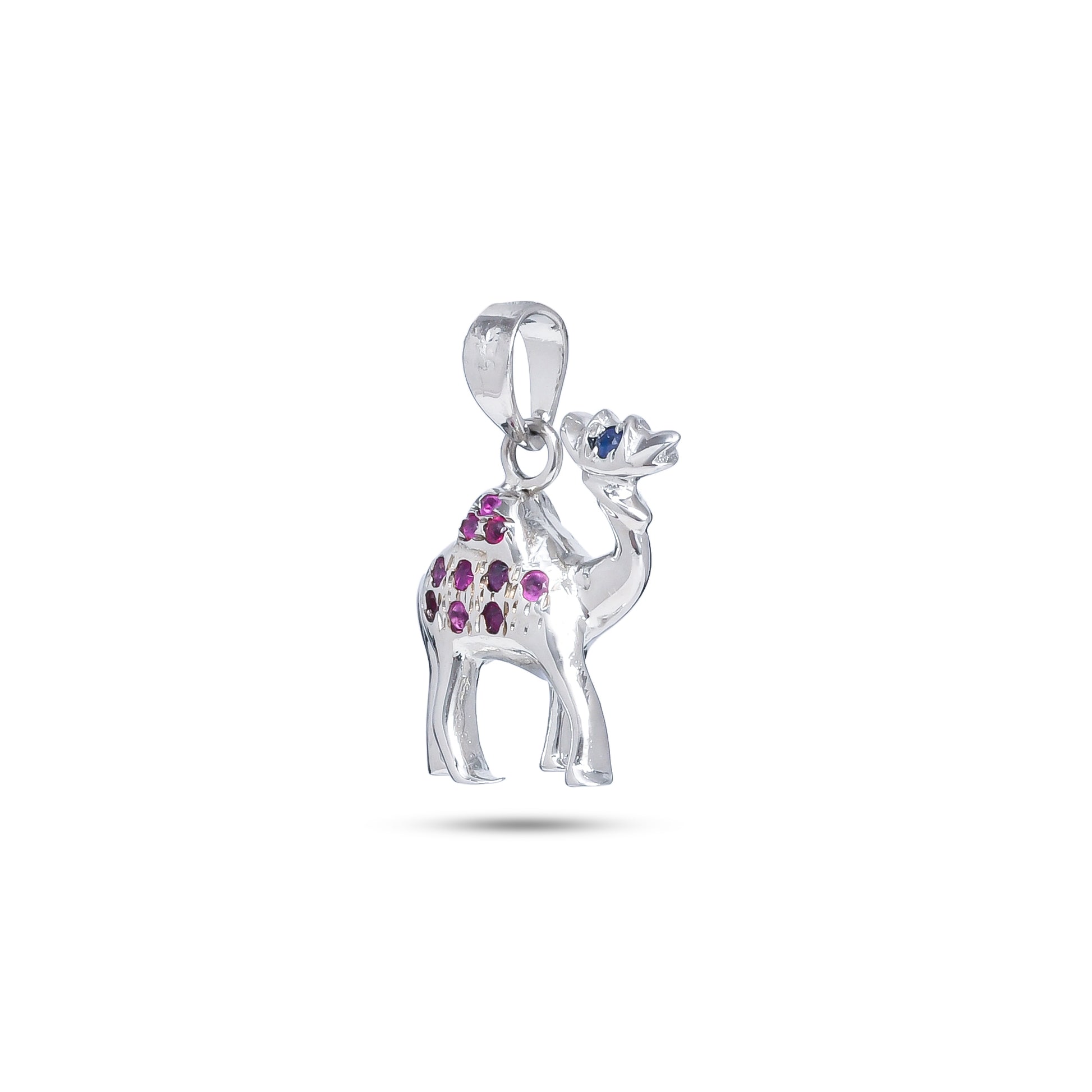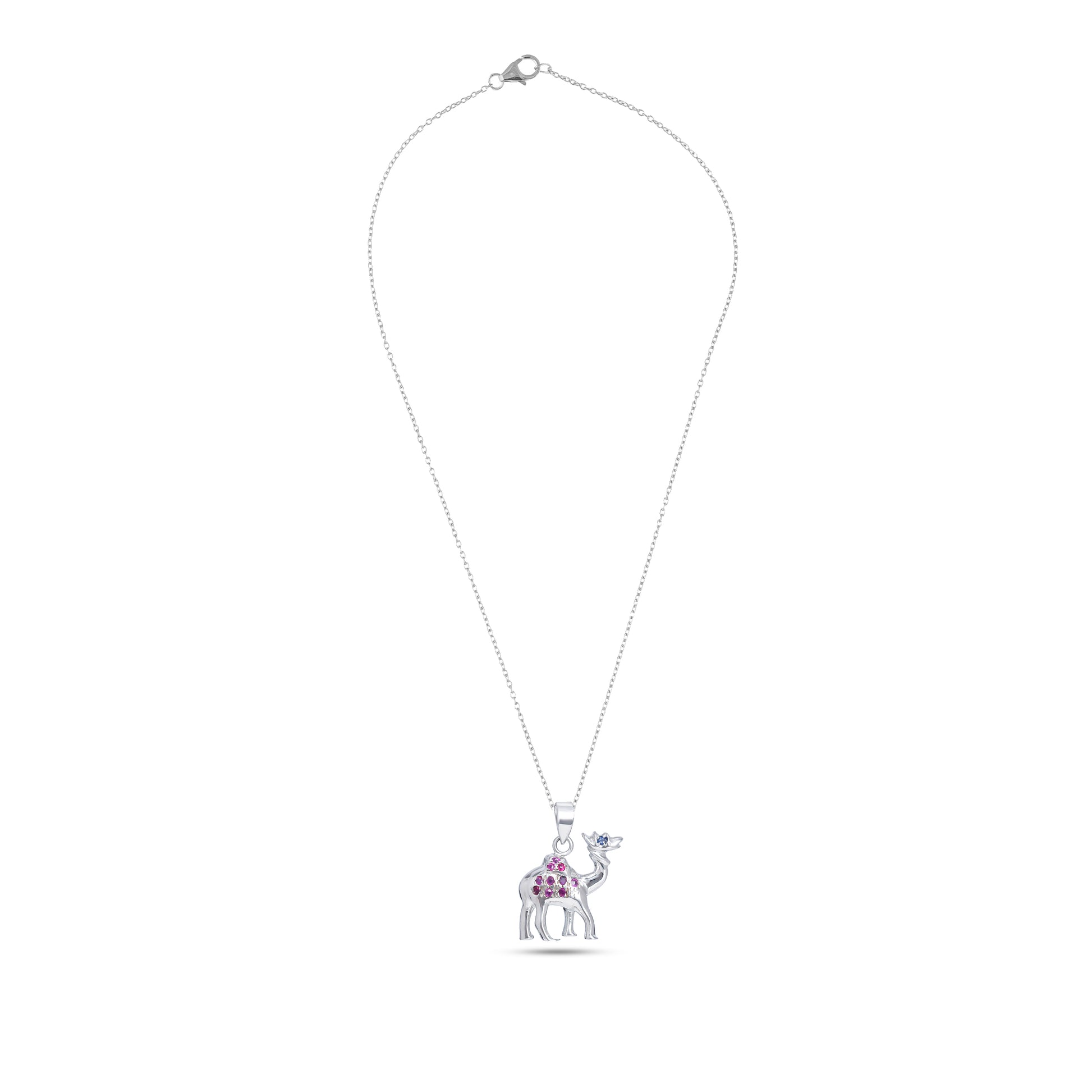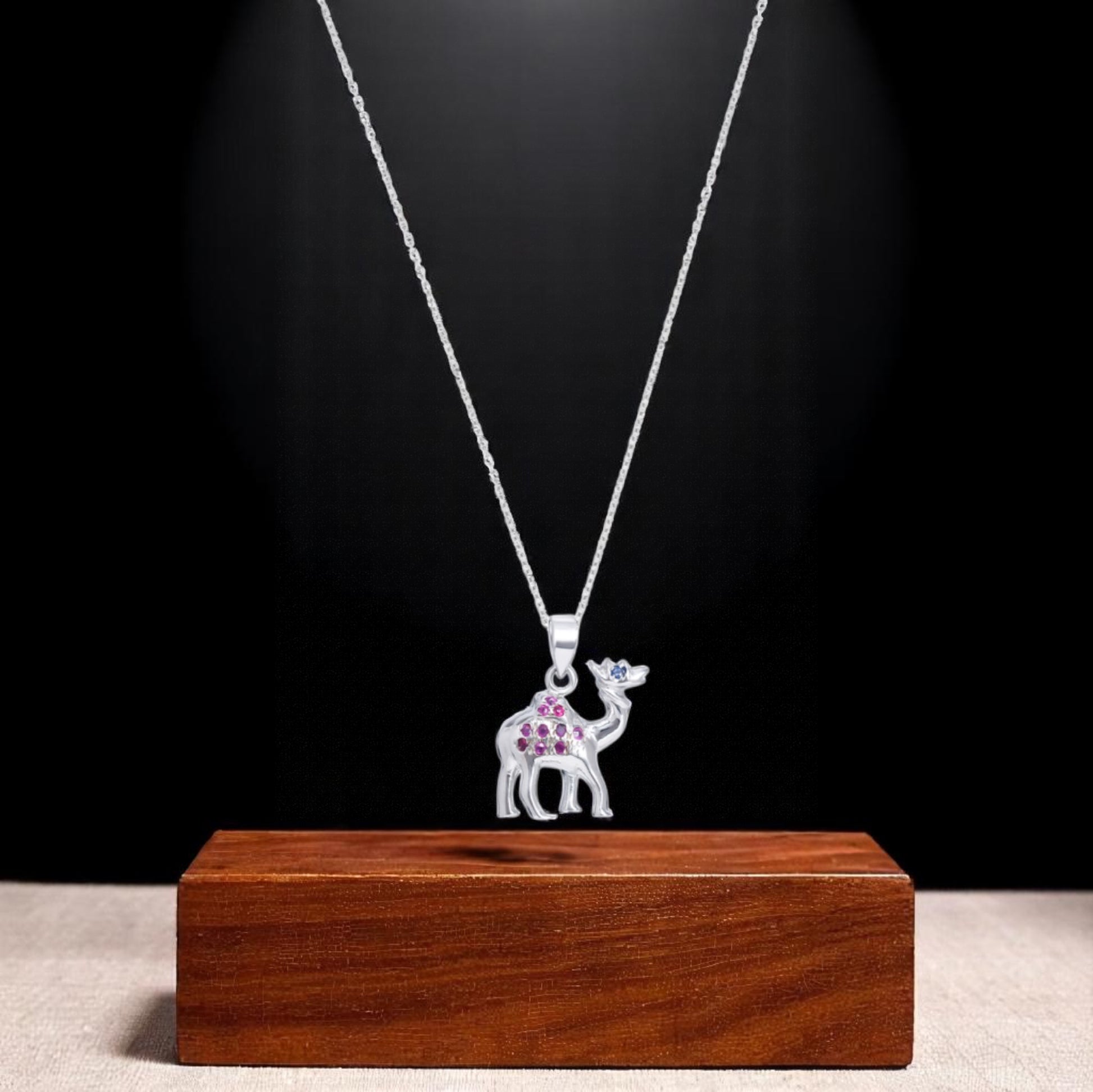 Celebrate exotic charm and playful elegance with this unique camel-shaped pendant. Expertly crafted in sterling silver, this whimsical piece features a beautifully detailed camel adorned with vivid pink gemstones on its body and a sparkling blue stone as its eye. The combination of vibrant colors and polished silver creates a lively, eye-catching accessory that adds personality and flair to any outfit. Perfect for travel lovers, collectors, or anyone who enjoys distinctive jewelry with a story.